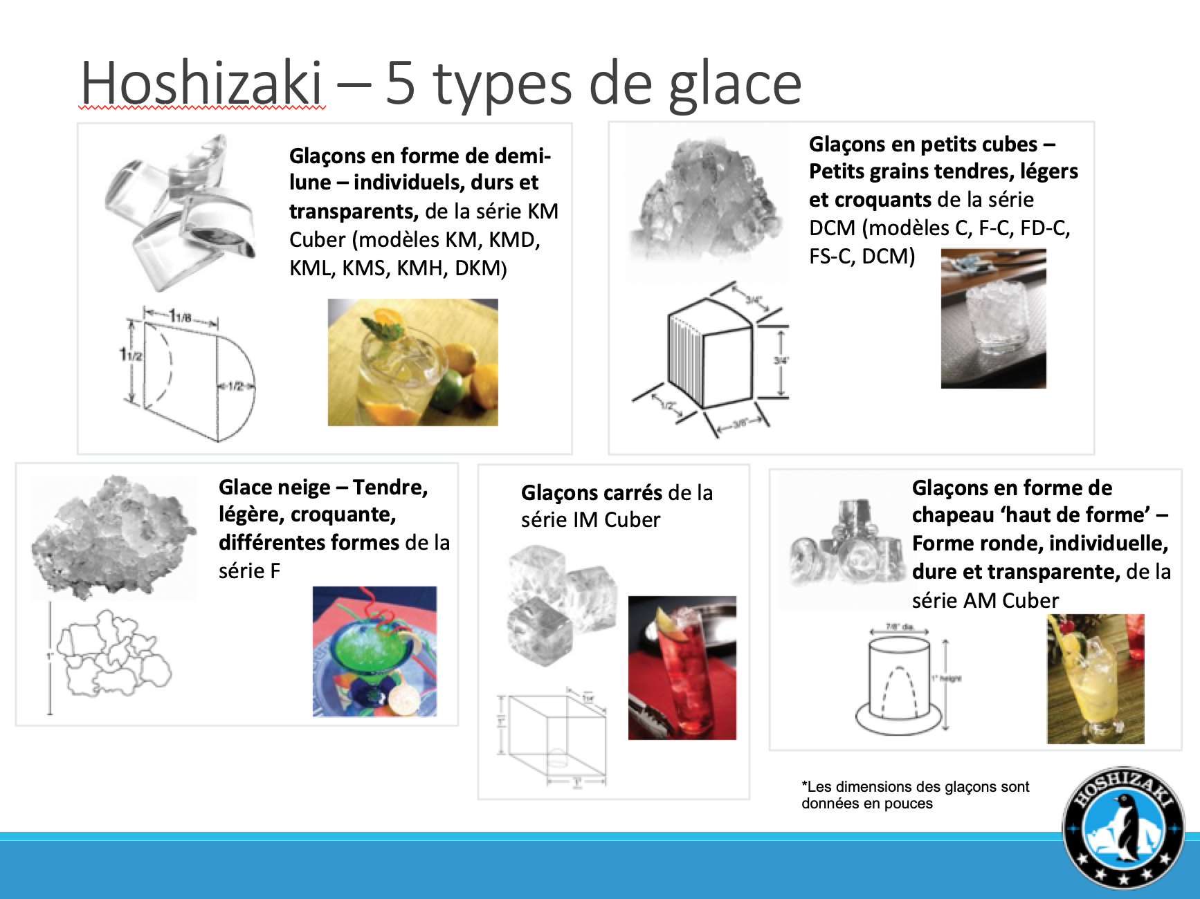 Il existe plusieurs variétés deglaçons, aux formes et tailles diverses... réfléchissez à l’utilisation que vous allez faire de vos glaçons. Avant de choisir la machine Hoshizaki la plus efficace,
